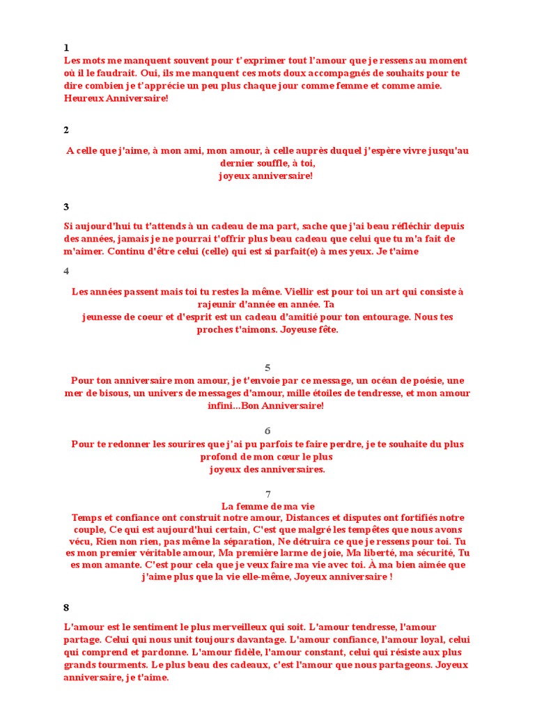 Les mots me manquent souvent pour t'exprimer tout l'amour que je ressens au moment où il le faudrait. Son chéri ou sa chérie. Aujourd'hui est une journée très spéciale alors que cette date soit un point de départ à de nouvelles découvertes et à de mon amour je te souhaite tout le bonheur toute la réussite et tout l'amour qu'une personne puisse avoir sur cette terre. Les mots me manquent souvent pour t'exprimer tout l'amour que je ressens au moment où il le faudrait.